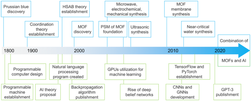 Fig. 3: Simplified development timeline of MOFs and AI. HSAB stands for hard–soft acid–base, while PSM stands for post-synthetic modification. CNN stands for a convolutional neural network, while GNN stands for a graph neural network.